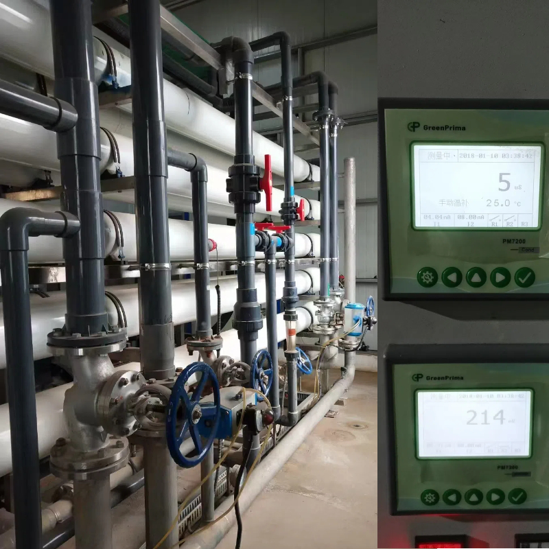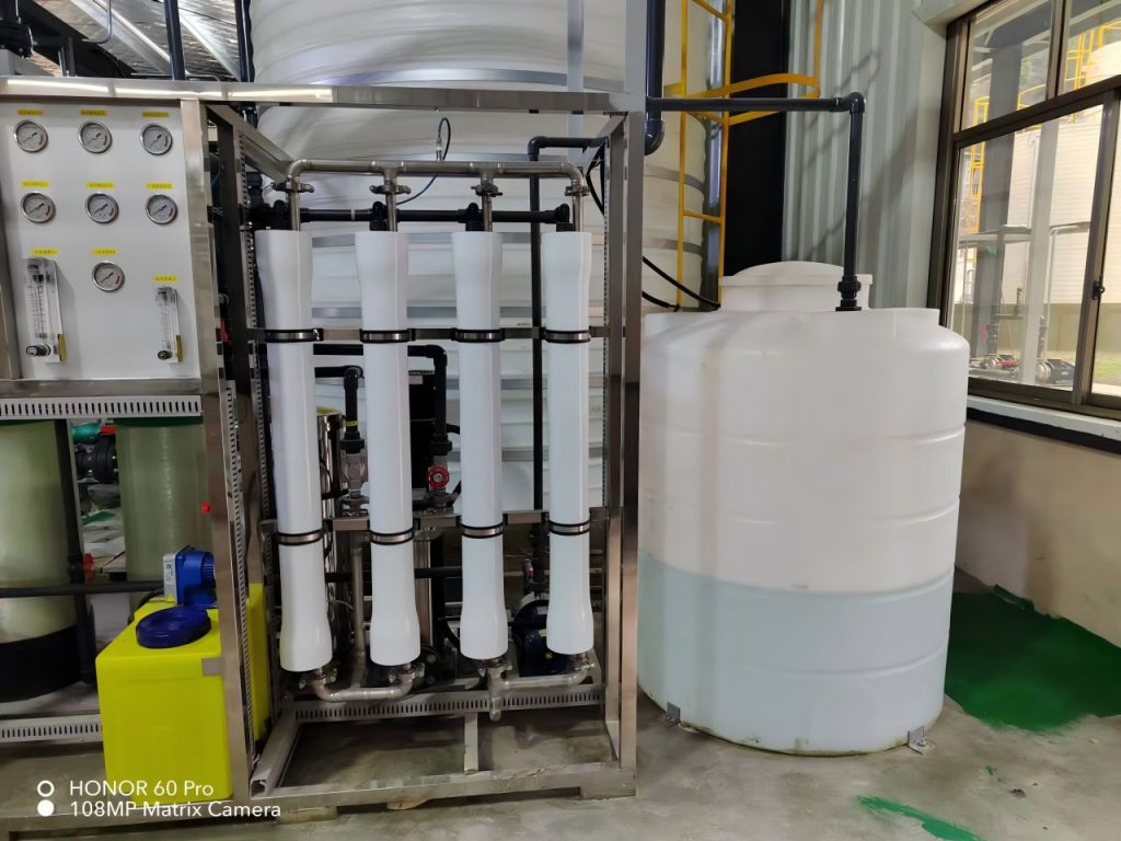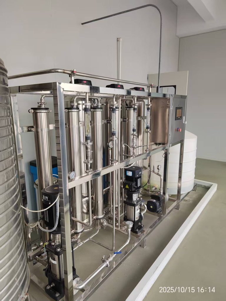 长沙某医药企业研发生产用纯化水机组,水源为自来水,采用砂滤+炭滤+离子交换软化+二级反渗透膜+EDI,设计产水量为0.5m3/h,产水满足《中国药典》纯化水要求。