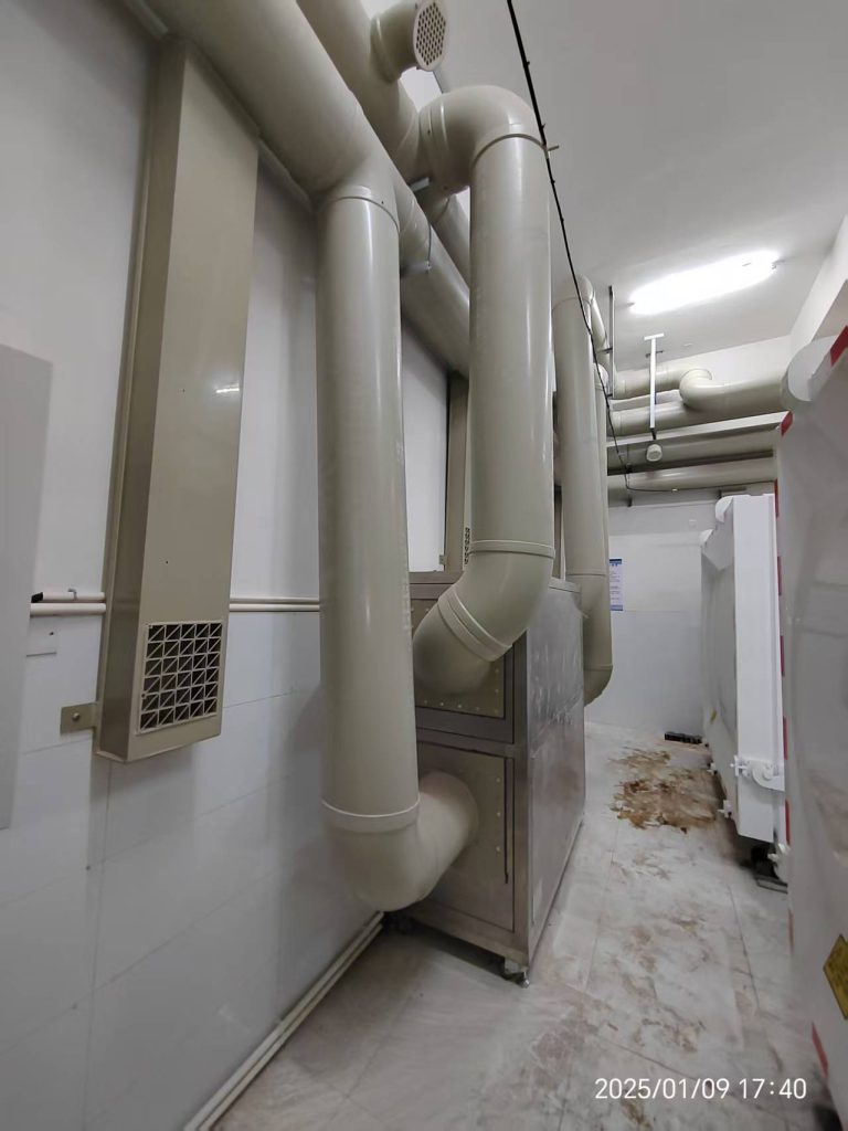 某医院检验科生物安全柜排风系统,采用负压收集+活性炭吸附,生物安全柜连锁与电动阀连锁,活性炭吸附净化排风机组,连锁风压变频控制。