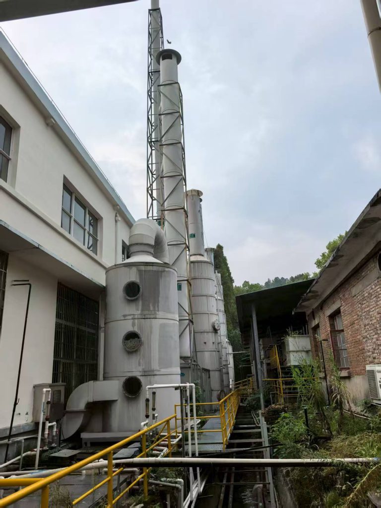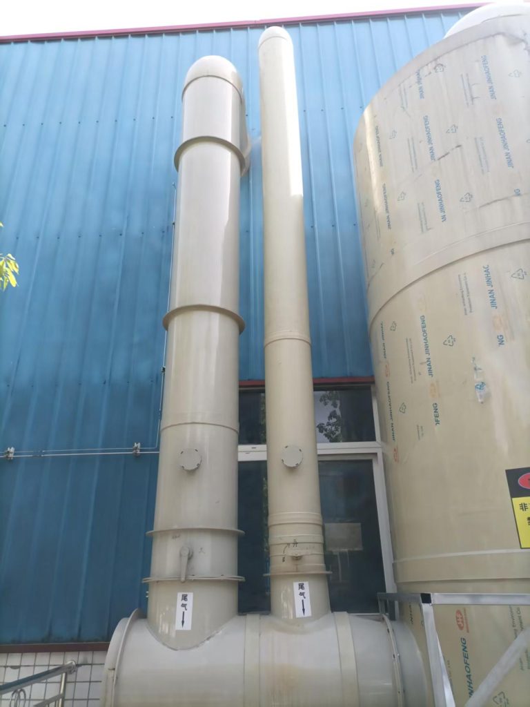 湖南宁乡某电池企业含氨尾气处理,采用PP喷淋塔稀硫酸喷淋吸收,二级喷淋一级除雾器,净化效率高,稳定达标排放。